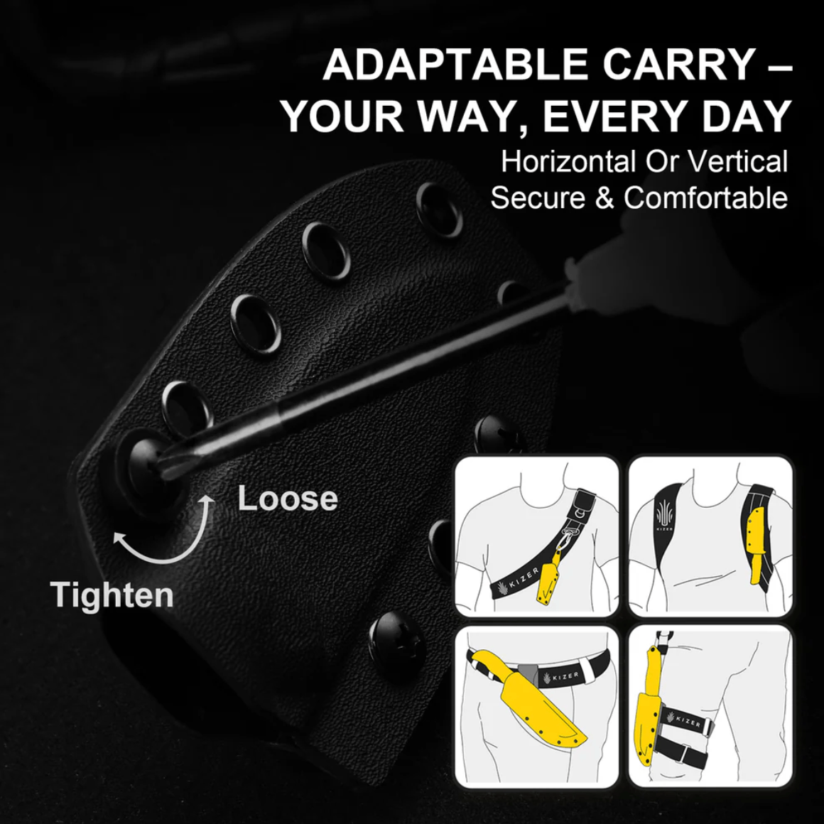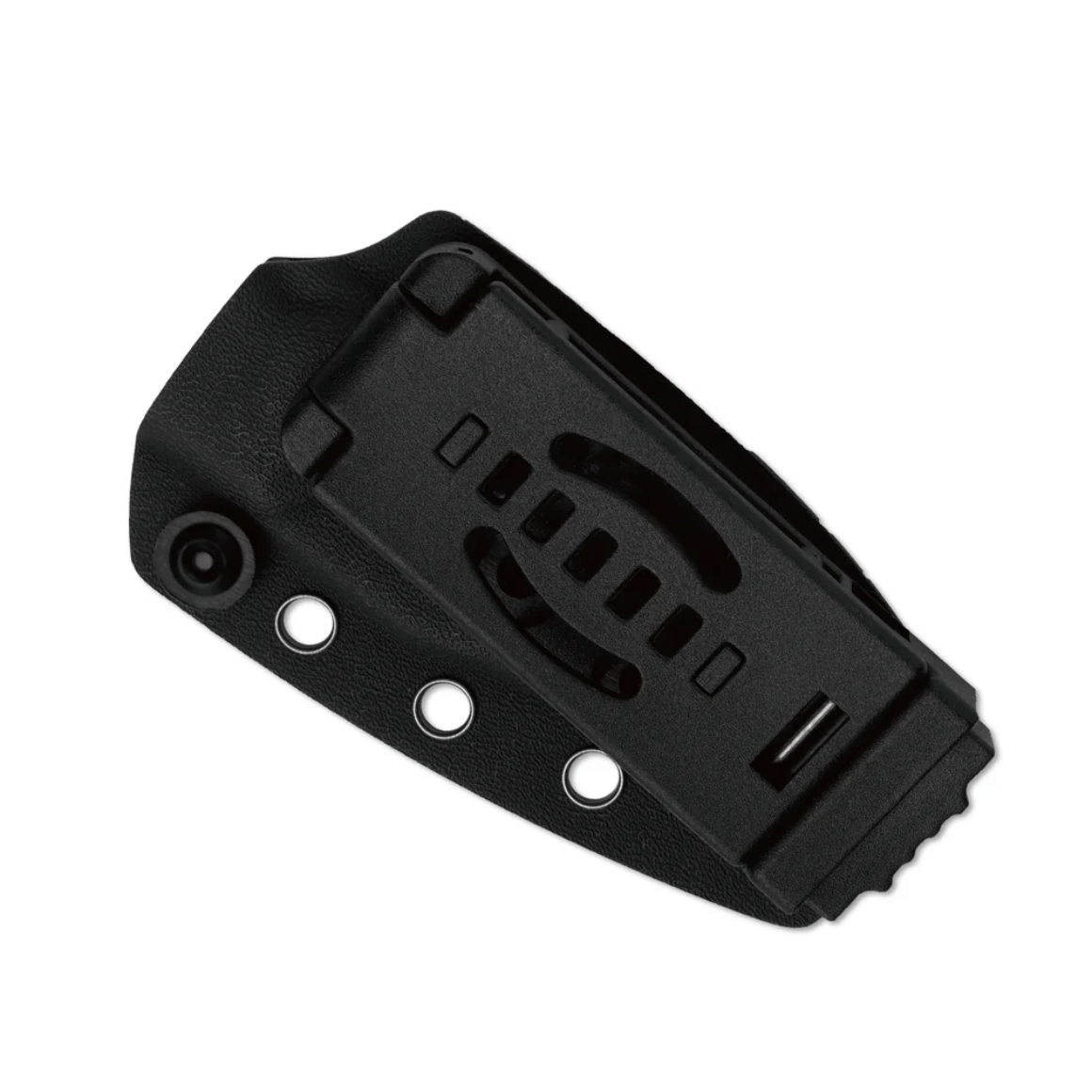 Komplektis on Kydexist tupp, mis toetab nii vertikaalset kui ka horisontaalset vööle kinnitamist, muutes selle praktiliseks valikuks igas olukorras.