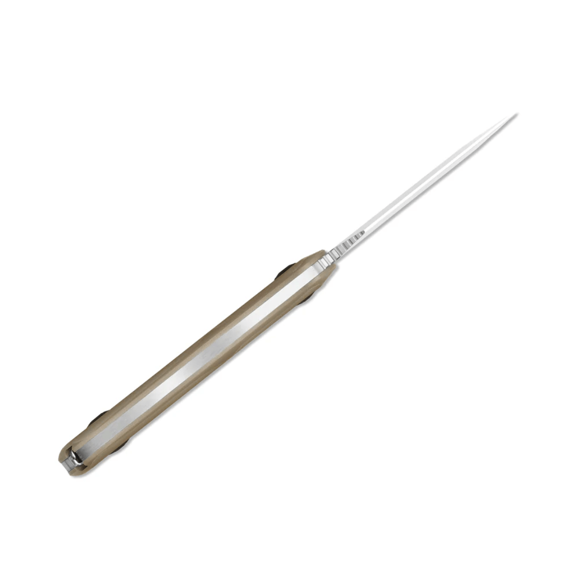 Käepide on valmistatud tan G10 komposiidist, pakkudes kindlat ja mugavat haaret, mida täiustab lai finger choil ja mitmeosaline jimping, tagades suurepärase kontrolli.