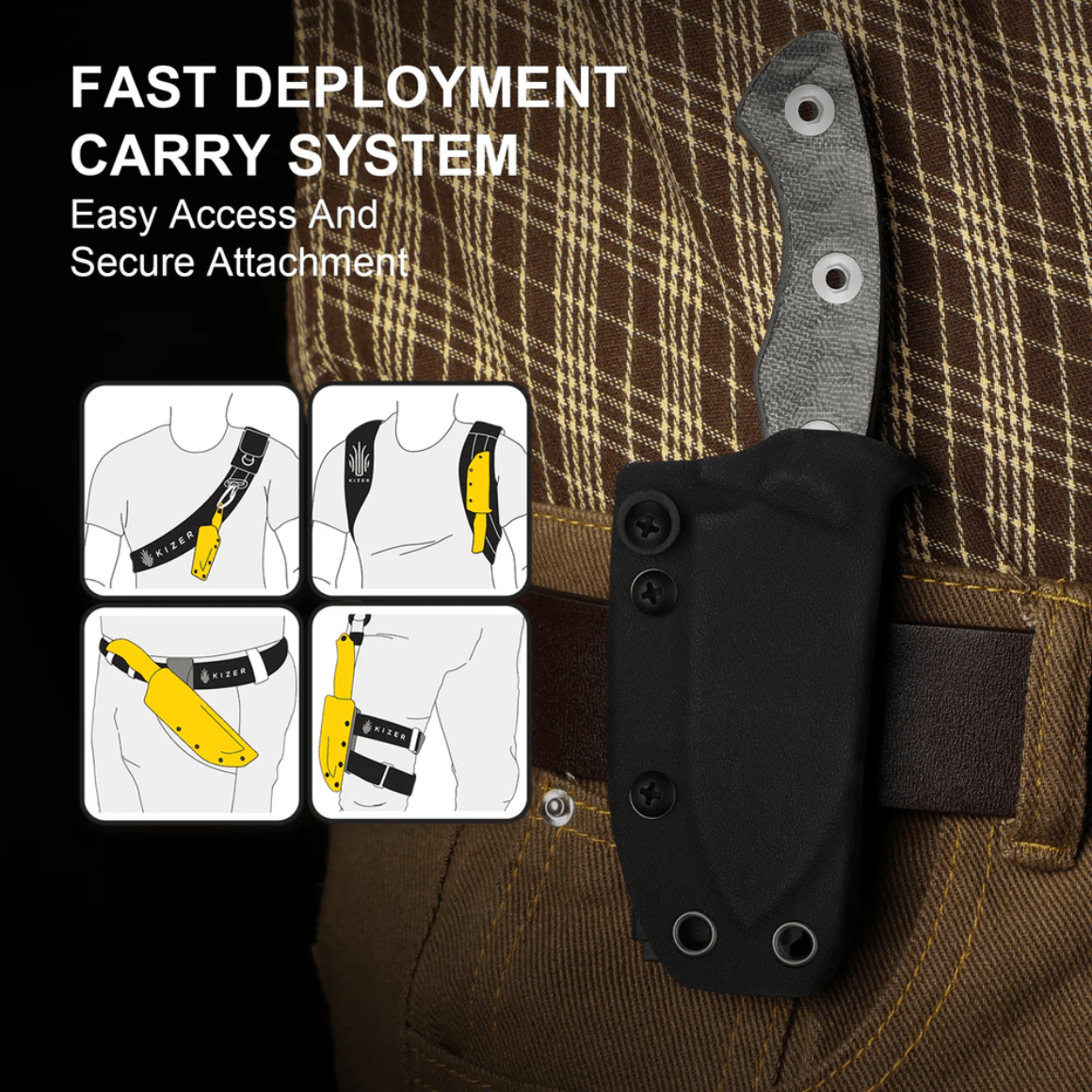 Unikaalne Nessmuk-stiilis fikseeritud nuga Kizer Rook 1090A2, mille on disaininud Vincent Rizzo, on ideaalne kaaslane laagris, pakkudes vaevata lõikamist – alates toidu täpsest viilutamisest ja uluki kergest nülgimisest kuni süütetiku töötlemiseni.