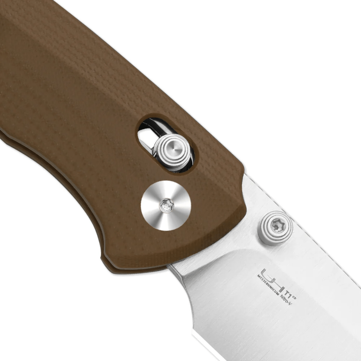 Käepide on valmistatud kõrgsurve lamineeritud G10 klaaskiudkomposiidist pruunis värvitoonis. See pakub agressiivselt tekstureeritud pinda kindlaks haardeks igas olukorras, on kerge ja väga vastupidav niiskusele ja kemikaalidele. Pööratav deep carry clip võimaldab nii diskreetset kui ka kohandatavat kandmisvõimalust. Nööriava toetab paracordi kinnitamist, pakkudes täiendavaid kandmisviise ja isikupärastamise võimalusi.