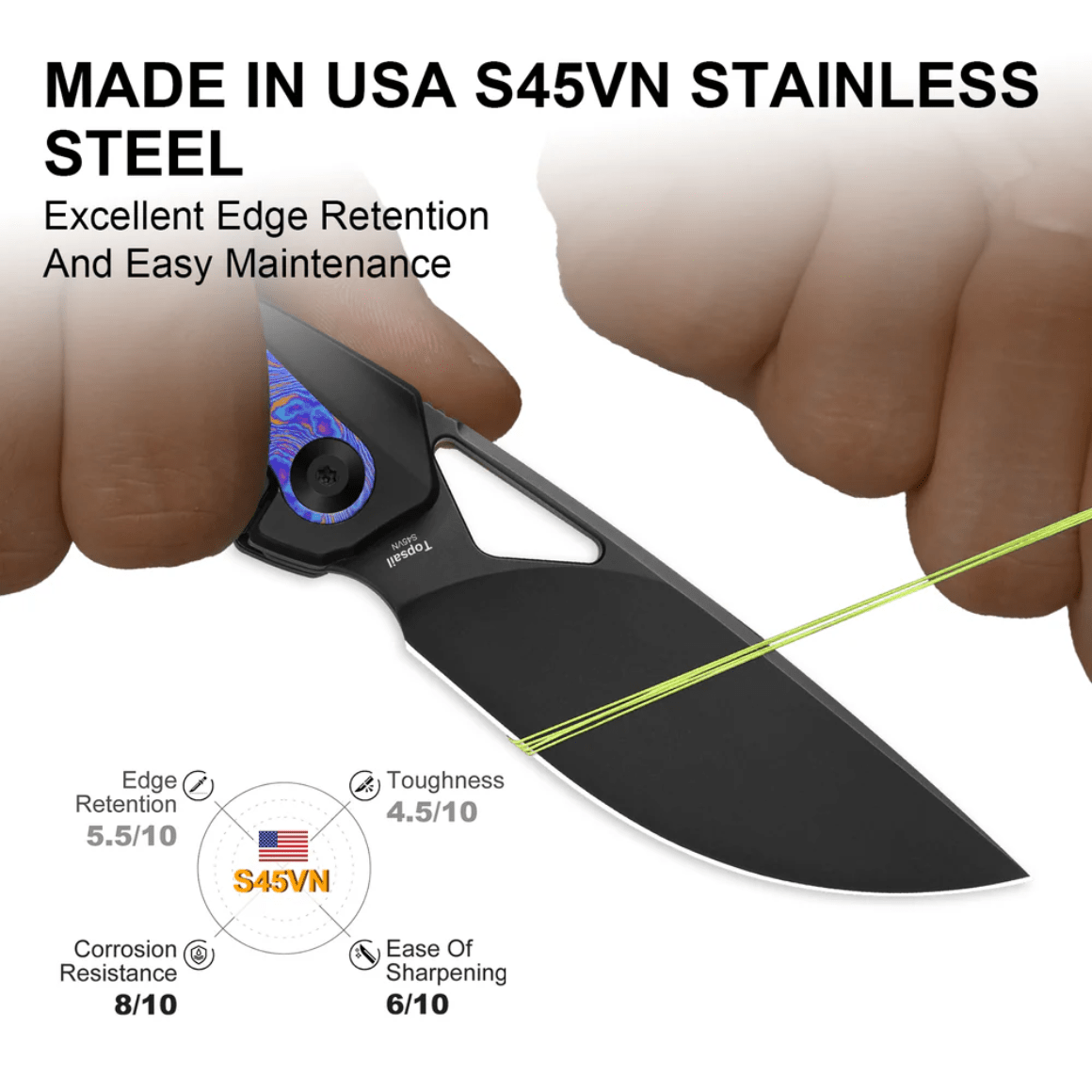 Drop Point tüüpi tera, millel on sile lõikeserv ja täislamelihv, on valmistatud musta mati DLC-Ultra viimistlusega USA roostevabast terasest S45VN, mis pakub erakordset tasakaalu lõikeserva säilivuse, tugevuse ja plekikindluse vahel.