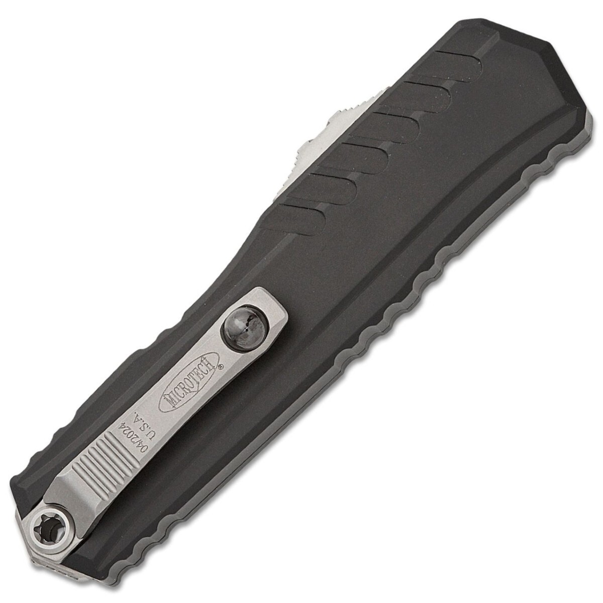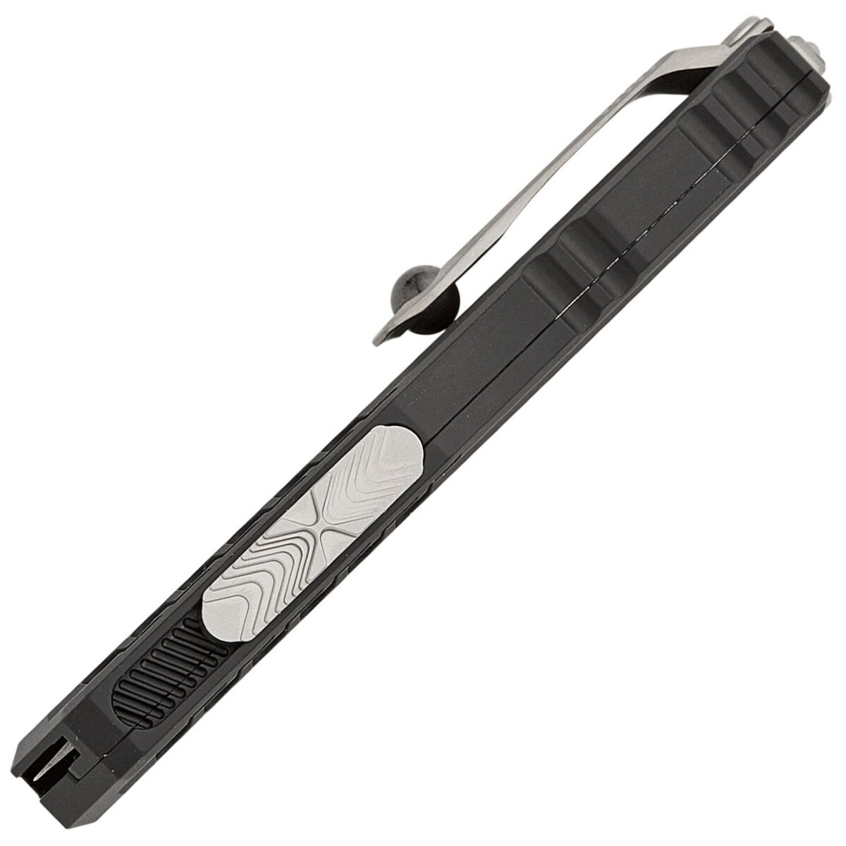 Microtech Cypher II on varustatud Bohler M390MK Wharncliffe teraga, millel on apocalyptic viimistlus, ja musta anodeeritud alumiiniumist käepidemega.
