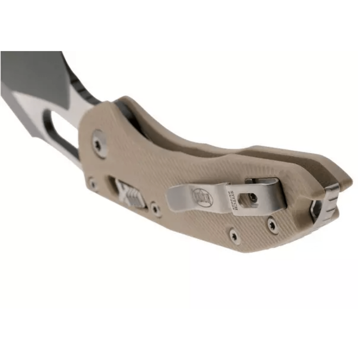 Kerge käepide on valmistatud fluted tan G10-st, mis on klaaskiust ja sünteetilisest vaigust koosnev komposiitmaterjal. Oma peene tekstuuriga tundub G10 käes suurepärane ja pakub kindlat haaret. Deep-carry pööratav taskuklamber on seatud tip-up kandmiseks.