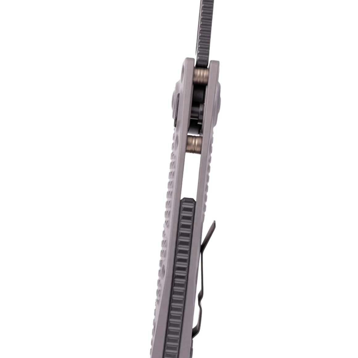 Käepide on valmistatud CNC freespinkidel suure täpsusega, kasutades naturaalselt läbipaistvat 6061-T6 alumiiniumi, millel on sügavalt freesitud Tri-Grip struktuur. Kahepoolne (parem/vasak) clip võimaldab nuga diskreetselt kanda tip-up asendis.